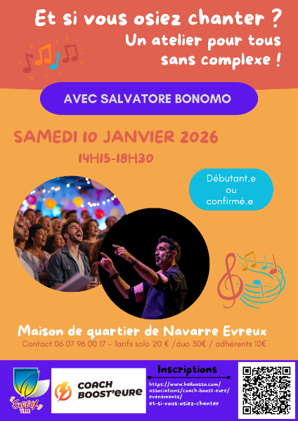 Ce samedi 10 janvier 2026, venez participer à un atelier pour tous, sans complexes. Animé par Salvatore Bonomo, partagez un moment artistique et chantant à la Maison de Quartier de Navarre de 14h15 à 18h30. Pour débutant comme pour confirmé, ce stage s'annonce enchanteur !
