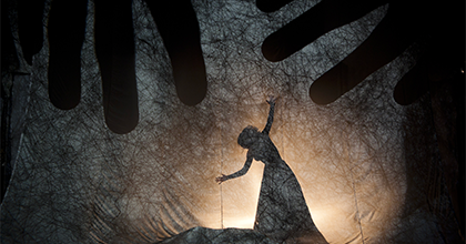 Les mains ce sont aussi celles de Camille Trouvé et de ses comparses de la compagnie Les Anges au Plafond. Une comédienne, une marionnettiste, une violoncelliste, une chanteuse, elles sont quatre « causeuses » pour composer un spectacle tout en ombres et lumières. Ensemble, elles jouent, dansent, sculptent, modèlent et manipulent afin de conter la destinée tragique de l’artiste aujourd’hui justement célèbre. Tourbillons de robes et envolées de voiles, tissus et papiers modelés, musiques, bruits et chants, projections et lanterne magique, la scénographie foisonne sans jamais perdre l’essentiel, le combat de la création et de la survie au féminin. L’œuvre tente de naître sous nos yeux mais les entraves sont nombreuses. Justesse et précision du geste, des propos, des faits rapportés ou suggérés, élégance des images, le quatuor des Anges modèle jusqu’à l’inversion, jusqu’au renversement de l’histoire lorsque soudain la marionnette façonne l’artiste.