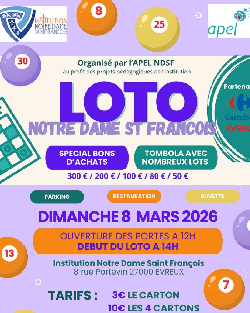 L'Association des Parents d'élèves de Notre Dame Saint-François organise un loto. Ouverture des portes à partir de 12h. Début du loto à 14h. A gagner des bons d'achats jusqu'à 300 €. Buvette et restauration sur place. Plus d'infos au 06 78 23 66 31.
