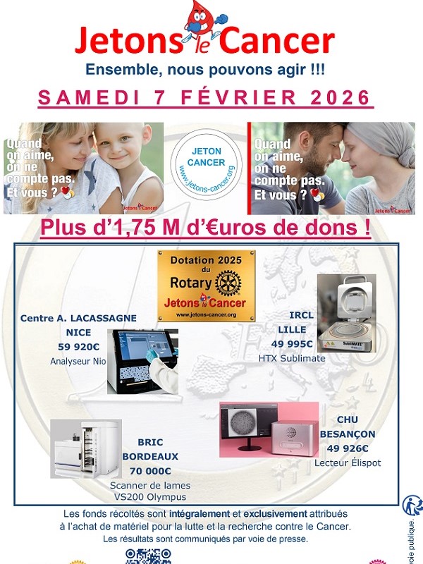 Les clubs Rotary d'Evreux vous donne rendez-vous à l'entrée du centre commercial Carrefour : le principe est simple échangez 1 € contre un jeton spécial. Les fonds recueillis serviront à l'achat de matériel pour la recherche et pour la lutte contre le cancer.