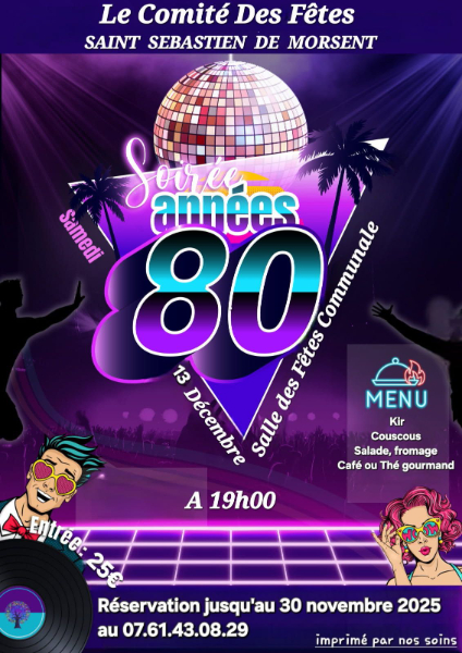 Le comité des fêtes organise une soirée années 80 samedi 13 décembre, à 19 h, à la salle des fêtes. Au menu : kir, couscous, salade, fromage et café ou thé gourmand. Entrée : 25 €. Réservation obligatoire jusqu’au 30 novembre au 07 61 43 08 29.