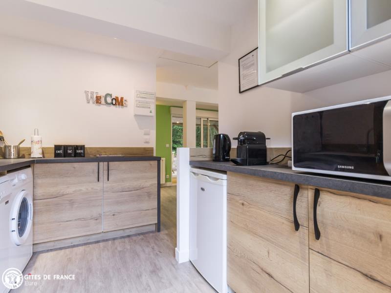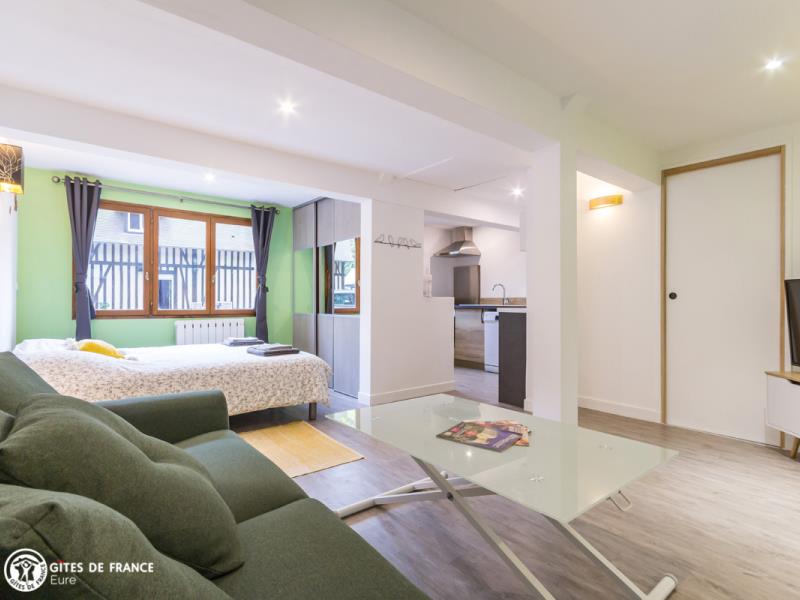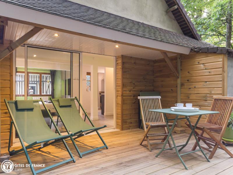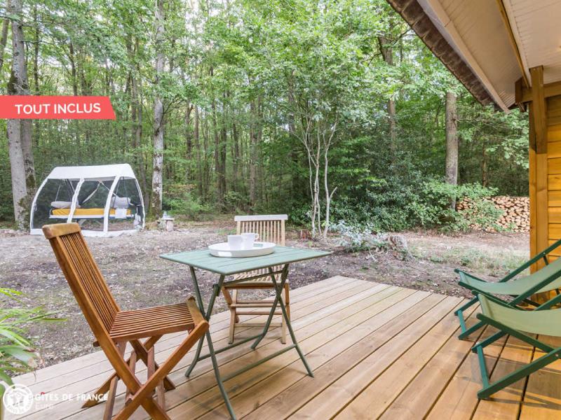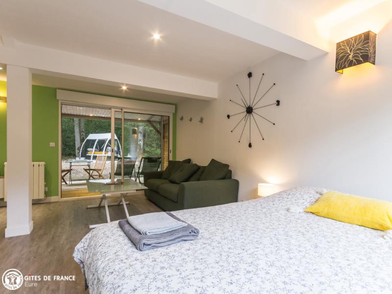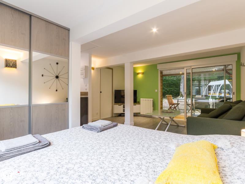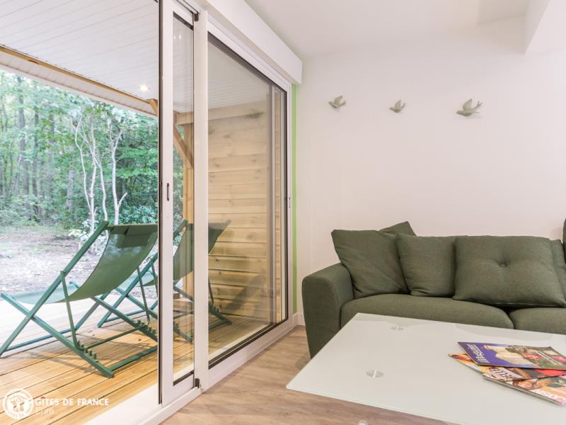 On aime le côté "dedans-dehors" de ce studio tout ouvert sur une jolie terrasse bois et la forêt par une grande baie vitrée.