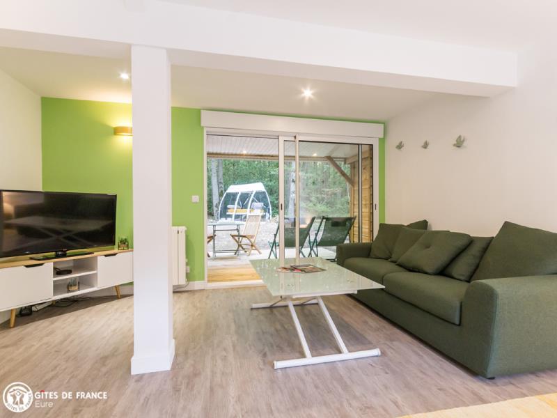 Agnès et Raphaël ont conçu ce lieu de vacances vraiment sympa dans un esprit loft moderne et chaleureux, cocooning et très confortable, dans des tons "nature" ; et ils sont pleins de belles idées : une sieste au grand air dans ce lit suspendu (accessible l'été), bercés par le chant des oiseaux ? ou bien, un peu plus loin, un moment de convivialité dans l'espace forêt partagé ?