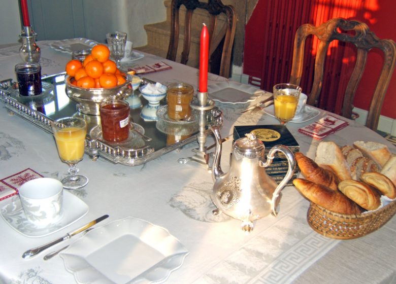 Dans le salon-salle à manger réservé aux hôtes, la journée commence autour d’un petit déjeuner généreux, servi sur une table où l’argenterie de famille brille gentiment, comme un clin d’œil à l’art de recevoir.